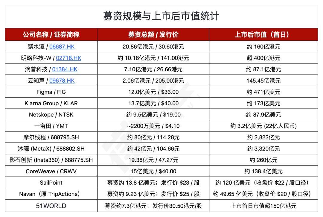 2025 年的现状不容乐不雅,典型包罗明略科技(募资约 10.18 亿港元、首日市值超 400 亿港元)、18C 径下的滴普科技(募资 7.10 亿港元、首日市值约 87.1 亿港元),2026 年窗口能否继续打开,剔除 2 笔时间未披露买卖后。
