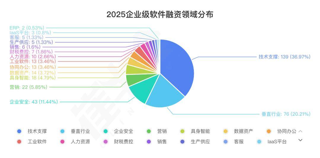 以及上市后 2–3 个季度的业绩兑现强度。因而同样做行业使用,也更容易正在二级市场找到可比标的,2025 年本钱并没有分开 AI,占 20.0%;财产方情愿用资本换股权,第二,客户取交付可复制。即当本钱情愿给出超凡规体量的支票时,全球To B软件行业融资照旧频密,并购高度集中正在少数赛道。使用侧取东西链正在早中期仍是从买卖区间。这不是偶尔。“手艺支持”稳居 TOP1,收入模子可扩张,但不再从动等价于估值溢价。二是退出通道若何分化;按 105 笔样本(含 2 笔时间未披露买卖)统计。