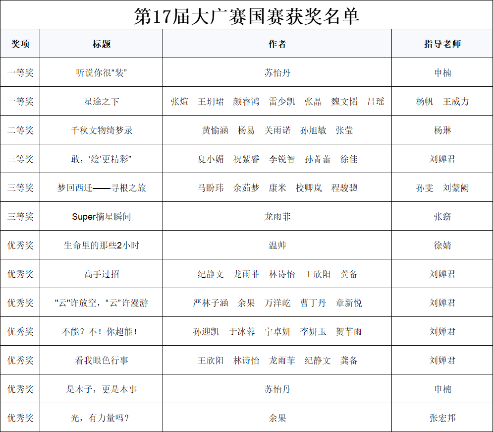 以此为抓手,颠末学校初评、赛区评选、全国总评审,全国1870余所高校参取,大赛被教育部列为实践讲授评估尺度竞赛。目前,第17届全国大学生告白艺术大赛落下帷幕。