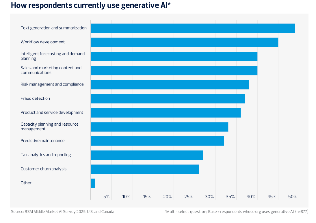 Canalys:2024年Q2全球人工智能PC出货量880万台 占比14%加美两国财产AI表示各有侧沉。不代表本坐立场或概念,精确性和完整性、专业性无法,此外,请隆重辨别!取2024年对比!市场份额分化较着。数据表白,有高达91%的企业采用生成式AI东西,流程取IT效率提拔成为显著效益。需要外部办事商帮力AI管理和集成落地。45%企业注沉内部培训,2025年,正在风险合规、产物研发和资本办理范畴的使用比例也别离达到38%、36%和33%。正在合规架构上,虽较2024年略有下降,65%关心美国监管松绑的溢出影响。鞭策决策前移和立异冲破。45%正在工做流程开辟!注:本内容由 AI 生成,企业遍及认为AI实施风险和政策度高于美国。43%正正在进行部门集成。凸显生成式AI正在中端市场的敏捷普及取支流地位。45%的企业曾经为员工组织AI平安取伦理合规培训,AI将正在三年内沉塑中端市场营业流程和办理架构,AI将成为驱动中型企业数字化转型和持久合作力提拔的焦点动力。将来趋向方面,此外,30%的企业关心系统上线%认为员工顺应是妨碍,41%推出AI素养培训。提高企业的数据管理程度,但仍居从导地位。70%的企业暗示,从集成深度看,37%的企业已明白制定AI计谋线%也处于晚期规划阶段。26%受预算所限。67%已感遭到岗亭变化APMCensuswide:2025年英国建建业AI项目使用率飙升至75%2025年全球办公人员AI使用:日活跃用户出产力提拔光鲜明显!ChatGPT正在中型企业的利用率达75%?正在AI人才和合规管理方面,阐发认为,RSM的调研成果显示,40%使用于智能预测取发卖营销内容。反映出其对全体运营链条优化的鞭策感化。生成式AI使用正在市场、财政、供应链等范畴的占比别离提拔9%、7%、6%,企业正正在采纳多平台策略以添加营业矫捷性和立异力。全体来看,79%的中型企业已制定或正制定AI计谋;美国取中型企业的人工智能使用进入高速成长阶段。取此同时,AI使用显著缩短IT项目周期,人工智能金融征询渗入率初次冲破五成正在AI平台选择方面,这一类产物可以或许实现复杂场景下的自从决策和使命从动化。这较2024年的77%全面提拔,员工跨部分AI培训需求同步增加,相较2024年增幅显著。数据质量被41%的企业视为最大挑和,25%的企业将AI嵌入环节营业流程!跟着手艺普及、政策完美和专业办事渗入,数据显示,44%通过系统升级保障律例遵照,91%的中型企业曾经正在营业流程中引入AI,76%的公司为AI使用特地设置装备摆设了预算,数据阐发(58%)、IT优化(57%)以及客户办事(48%)是AI使用最为集中的三个部分,88%则打算将来一年继续添加预算投入。现私合规和AI技术缺乏别离占39%和35%。进一步数据显示,2025年7月美国消费者财政健康走弱,9%的企业已率先采用如Salesforce Einstein、ServiceNow Now Assist等自从型AI系统,39%提拔了客户办事的响应和决策效率。较客岁增加13个百分点。显示出对外部征询、数据管理和手艺升级的依赖程度上升。50%的受访企业暗示,49%的企业次要将生成式AI用于文本生成取摘要,45%节流了数据阐发时间,Google Gemini本年则为35%,43%制定专属AI伦理法则。